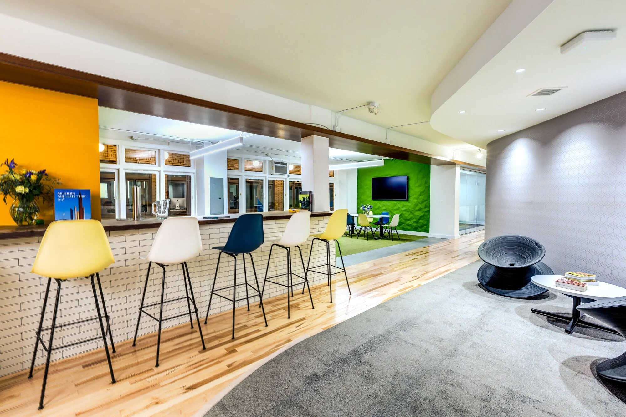 The main break area was designed as a retreat from the workday, offering multiple screens for the staff to watch their preferred sports team, Ann Arbor FC. A textured wall at the far end of the kitchenette helps provide a visual cue for the space, and aligns with similar cues deeper in the space. The bar seating area features a 14’ live-edge slab, sourced from a local timber mill, and fabricated to include an array of structural steel shapes to ensure flatness over time.