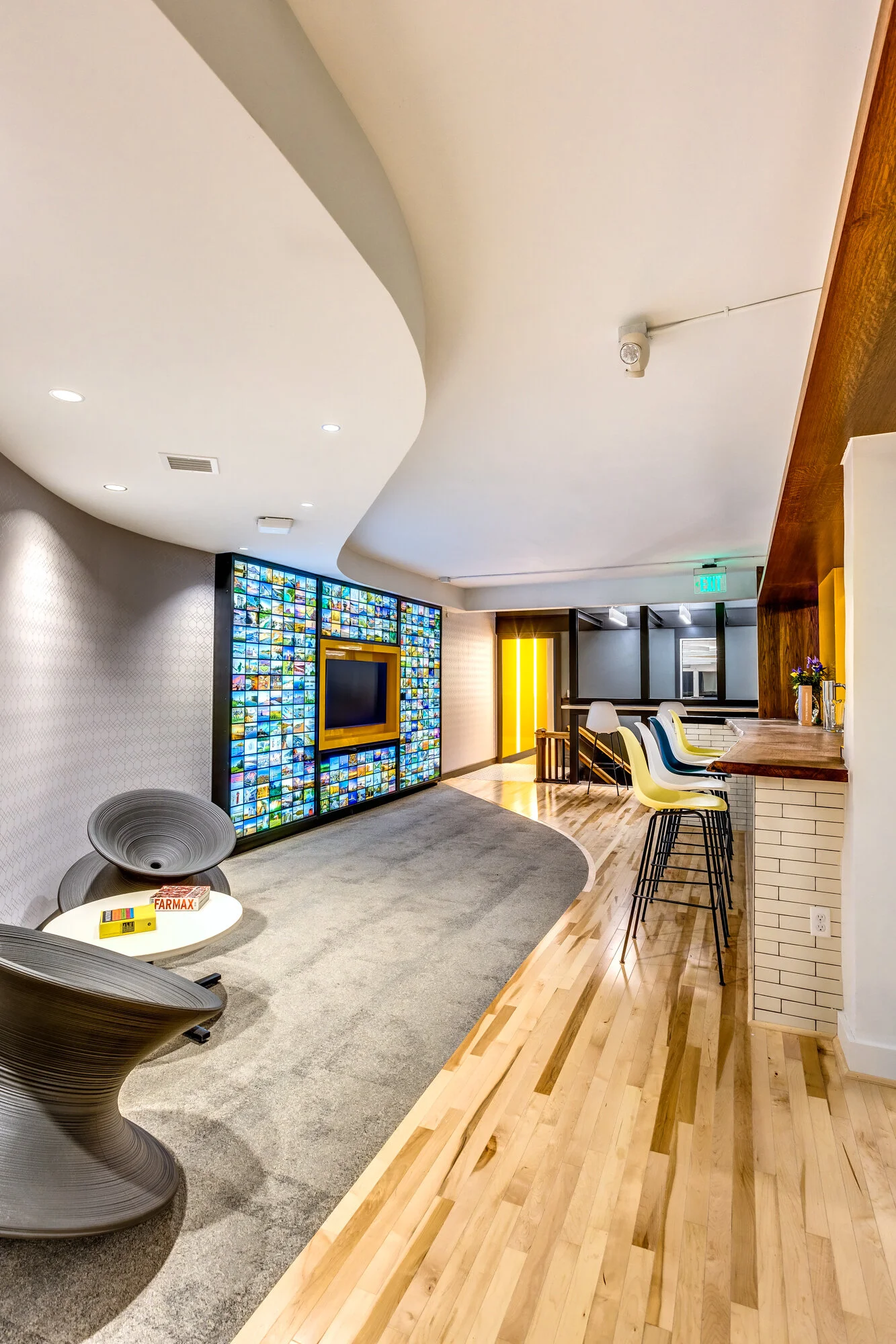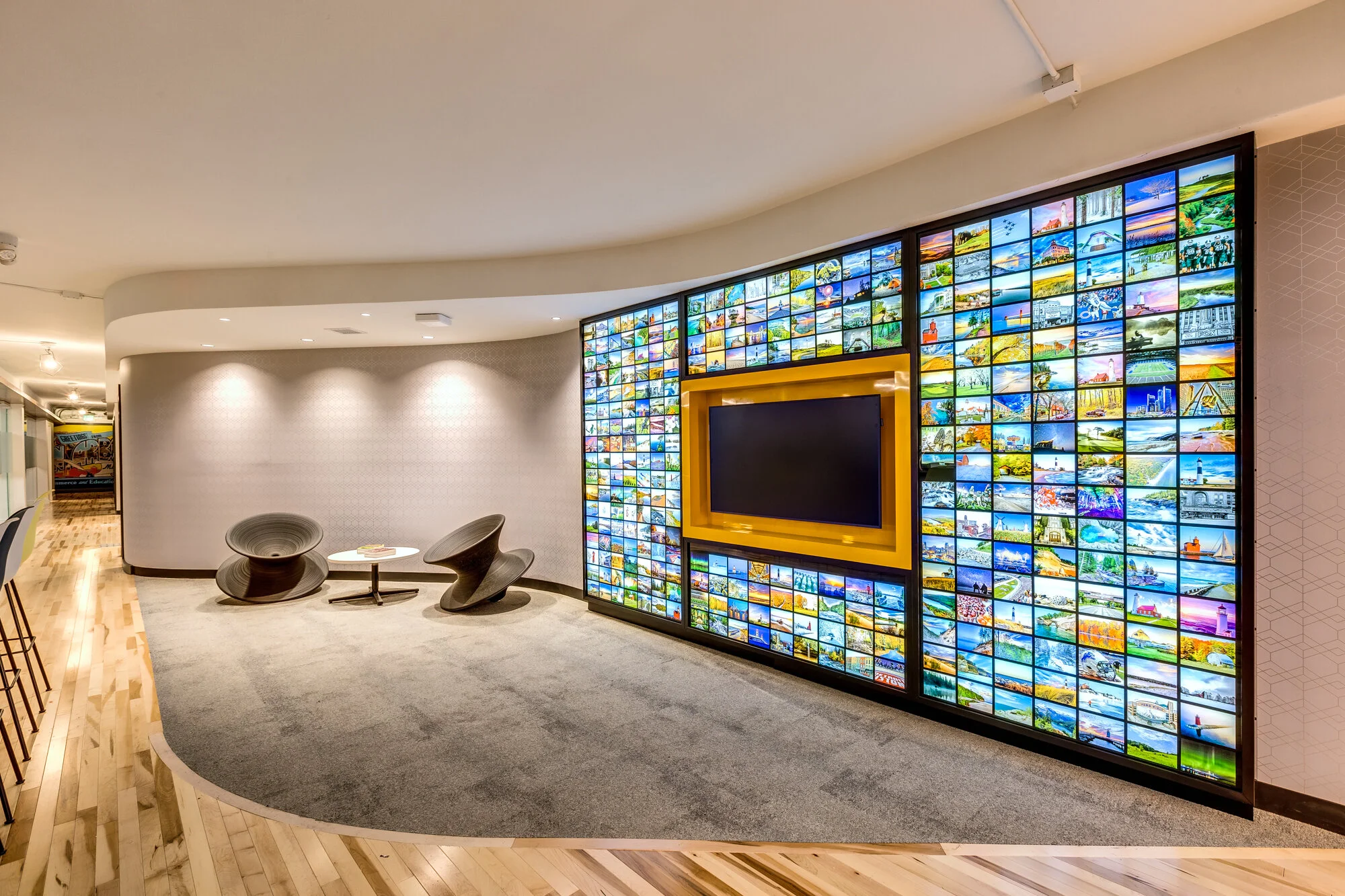 The waiting area features an internally-illuminated photo wall, composed of historic and scenic photos from around the state of Michigan, helping the office provide a sense of place, a theme throughout all Expedia offices.