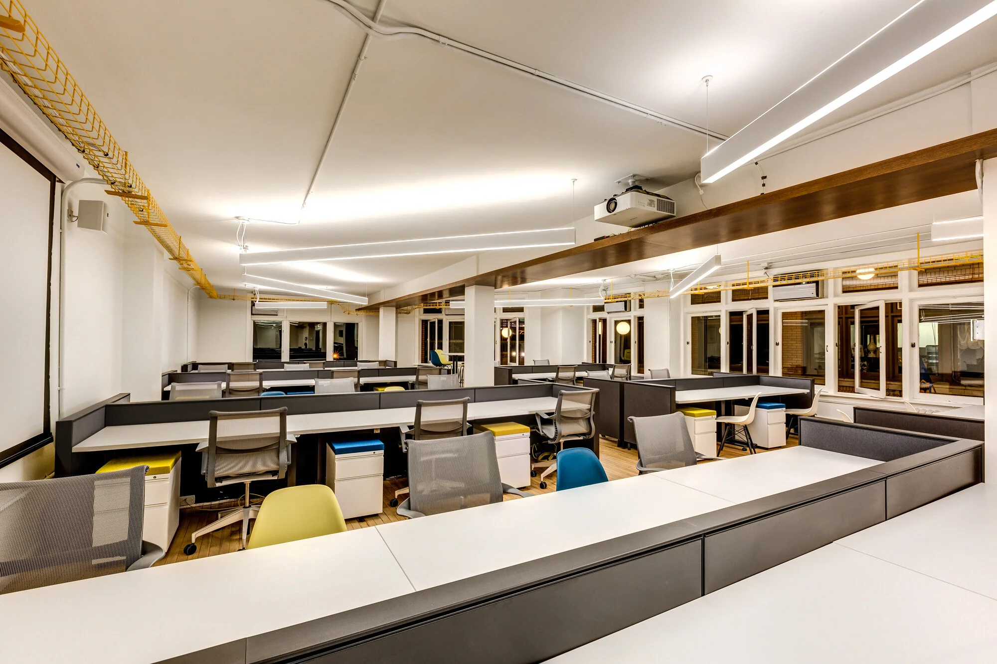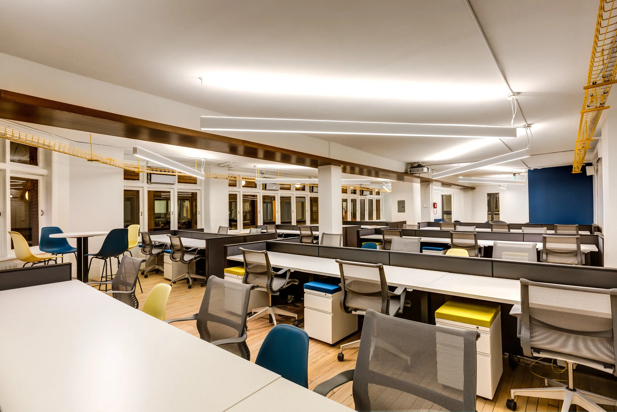At the opposite end of the space, a high-gloss portal emphasizes the separation of the heads-down office space from the more collaborative areas. The office space features a projector and screen for impromptu all-hands meetings, and a millwork cable tray runs down the central axis of the space, providing a visual connection to the open collaborative areas beyond.